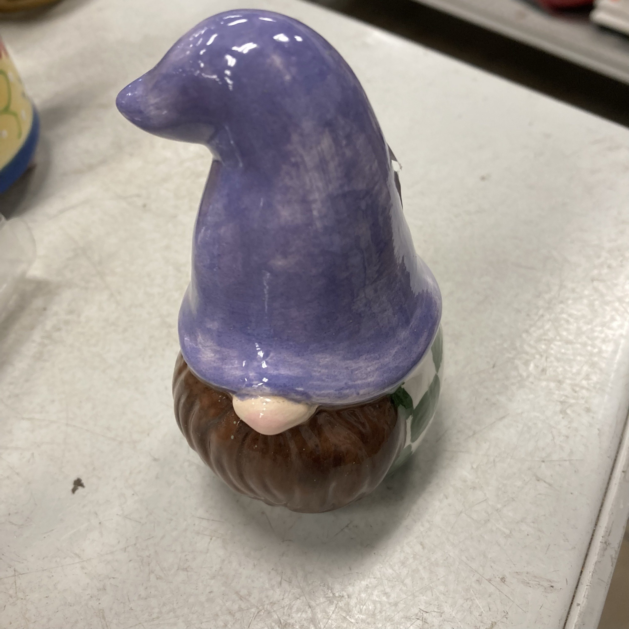 This item is a novelty shaker fashioned in the likeness of a whimsical garden gnome. Constructed from glazed ceramic, the figure stands approximately 3 to 4 inches tall. The piece is characterized by a prominent, textured dark brown beard that wraps around the lower half, a light pink bulbous nose, and a large, floppy conical phrygian-style hat in a mottled lavender or periwinkle purple hue. The hat features a slightly down-turned tip and visible brushstrokes in the glaze, suggesting a mass-produced item designed to mimic a hand-painted aesthetic. The side reveals a glimpse of a rounded body decorated with green and white patterns, likely representing floral or geometric elements. The overall construction is smooth with a high-gloss finish. Regarding condition, the piece appears to be in good used condition with reflective highlights from the overhead lighting; however, there is a small noticeable white blemish or possible chip on the rear right side of the purple hat. The style is contemporary, likely dating from the 2010s to present, following the popular 'modern farmhouse' or cottagecore decor trends. There are no visible maker's marks or stamps from this angle, though most such pieces typically feature a plastic plug on the base and small dispensing holes at the top of the hat.