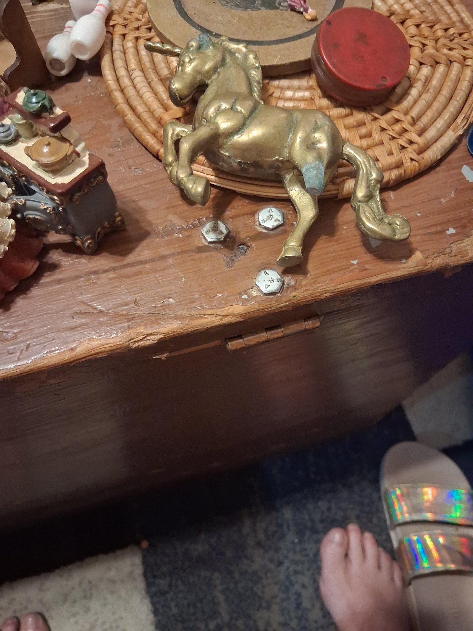 This is a vintage cast brass figurine of a unicorn, depicted in a dynamic, rearing or galloping pose. The object is constructed from a heavy solid brass alloy, exhibiting a warm gold-yellow metallic color with areas of significant oxidation and age-related patina. Physically, the unicorn features a stylized mane, a thick flowing tail, and a single spiral horn. The craftsmanship suggests a mid-20th-century decorative piece, possibly from the 1970s or 1980s when brass mythological figures were popularized. Notable condition issues are present, most significantly a missing rear leg which has been snapped off, revealing the internal grain of the metal and a greenish-blue verdigris corrosion at the break point. There are also visible spots of green oxidation near the head and horn. The surface shows minor pitting and scratches consistent with handling and age. No specific maker's marks or signatures are immediately visible on the upward-facing side. The item is resting on a woven wicker tray alongside other disparate objects, indicating its current state as a secondhand or salvaged collectible.