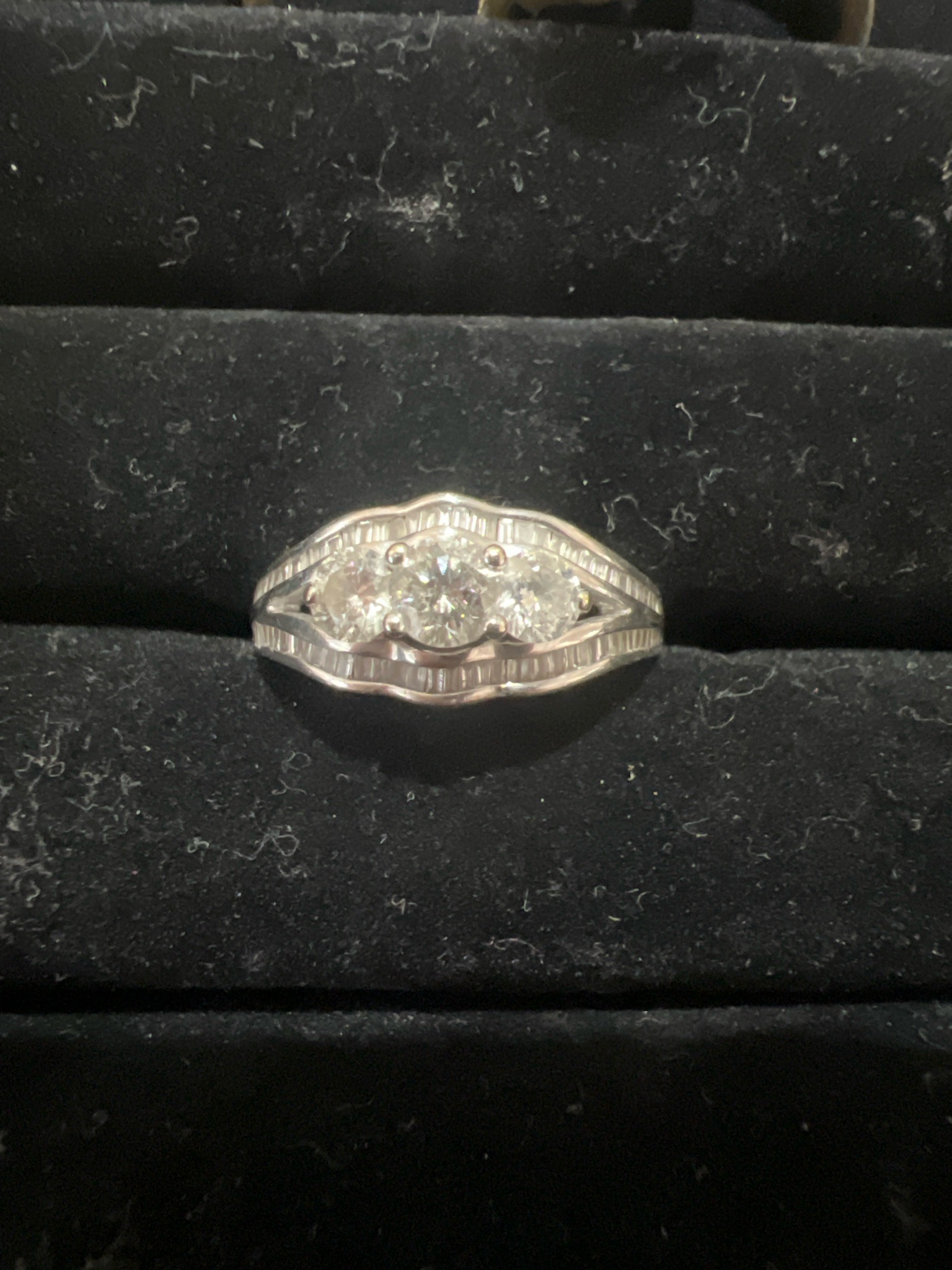 This is a contemporary-style fine jewelry ring featuring a central three-stone round brilliant-cut diamond arrangement. The diamonds are set in a low-profile white metal mounting, likely 14k or 18k white gold or platinum, though no hallmark is visible in the photograph. The central three round diamonds are prong-set in a horizontal row, flanked by two scalloped borders of channel-set tapered baguette diamonds that follow the undulation of the center stone settings. The baguette diamonds create a radiant, halo-like effect that tapers as it flows toward the shank. The overall design suggests a late 20th-century or 21th-century 'past, present, future' anniversary or bridal style. The metal appears to be in good polished condition with minimal visible surface abrasions. The round diamonds exhibit significant flash and fire, suggesting a good to very good cut quality, though internal clarity cannot be definitively determined without magnification. The channel setting for the baguettes appears secure and well-crafted. This piece represents a high-quality example of multi-stone cluster design, prioritizing total carat weight and brilliance through a tiered setting architecture.