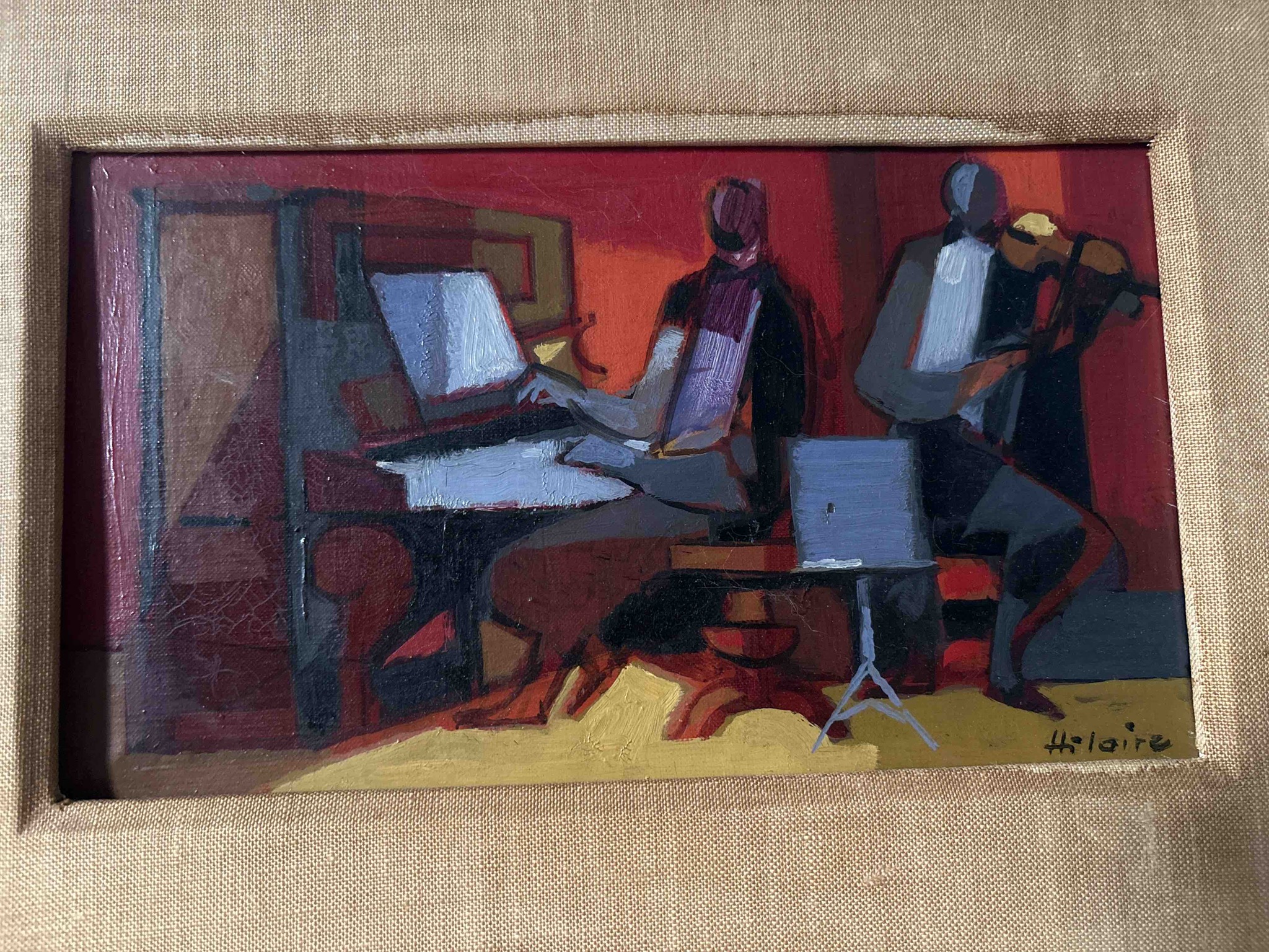 This is a small-format oil on canvas or board painting depicting a musical duo, identified by the signature in the lower-right corner as the work of French artist Camille Hilaire (1916–2004). The composition features a pianist and a violinist rendered in a distinct post-cubist, modernist style. The palette is dominated by deep reds, burgundies, and ochres, contrasted with cool greys and lavender highlights. The figures are abstracted into geometric planes, a hallmark of Hilaire’s mid-20th-century aesthetic. The application of paint involves visible brushstrokes and some impasto techniques, particularly in light reflections on the sheet music. The artwork is housed within a contemporary recessed linen-covered matting. Regarding condition, there is a prominent network of fine age-related craquelure visible in the lower-left quadrant, specifically over the dark brown and maroon sections near the piano leg. The paint surface appears stable, though the texture suggests a significant passage of time. The signature 'Hilaire' is written in a dark cursive script that matches known authentications of the artist’s hand. The work likely dates to the 1950s or 1960s, reflecting the high-quality craftsmanship of the French 'School of Paris' during that era. The use of light and shadow creates a moody, interior atmosphere typical of Hilaire's explorations of music and leisure.
