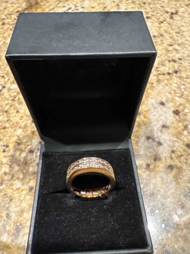 This item is a contemporary-styled wedding or anniversary band crafted from 14-karat yellow gold. The band features a wide, robust profile with two distinct rows of small round-cut diamonds set into the upper half of the shank. According to provided specifications, the total diamond weight is approximately 0.50 carats. The diamonds are likely channel or pavé set, providing a seamless and sparkling aesthetic across the top of the finger. The gold exhibits a high-polish finish with a warm yellow hue characteristic of 14k alloy. Physically, the ring appears to have a thick, flat interior for a comfort-fit feel. While the maker's mark is not visible in the photograph, the craftsmanship suggests a modern production, likely from the late 20th or early 21st century. The condition shows light signs of wear consistent with regular use, including minor surface abrasions on the gold shank and a slight accumulation of dust or oils around the stone settings, which is typical for pre-owned jewelry. The structural integrity remains intact with no visible missing stones or significant deformations. This piece represents a classic example of fine jewelry suitable for bridal or milestone gift purposes.