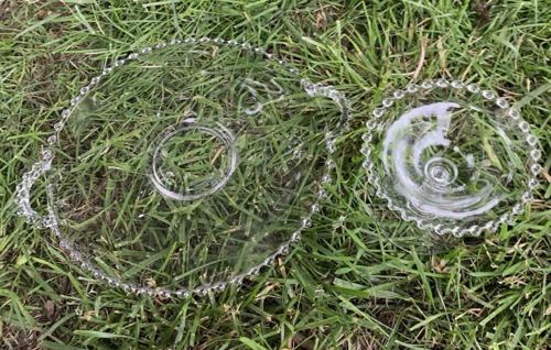This set consists of two pieces of clear pressed glass in the iconic 'Candlewick' pattern, popularized by the Imperial Glass Company starting in the late 1930s. The first item is a large circular serving tray or cake plate featuring two scalloped handles. The most distinguishing characteristic of this set is the decorative beaded edge consisting of small, uniform glass spheres, often referred to as 'booped' or 'balled' edges. The second piece is a smaller, footed compote or candy dish featuring a matching beaded rim. Both pieces are made of transparent flint glass with high clarity. The craftsmanship displays the typical mid-century American pressed glass style, with smooth interior surfaces and consistent bead sizing. Notable features include the central indentation on the tray intended for a bowl or dome. Condition appears fair to good with no large visible cracks, though minor surface scratches and 'flea bites' on the beads are common for this pattern due to age and usage. This pattern remained in production for decades, making it a classic example of American Depression-era and Mid-Century Modern glassware.