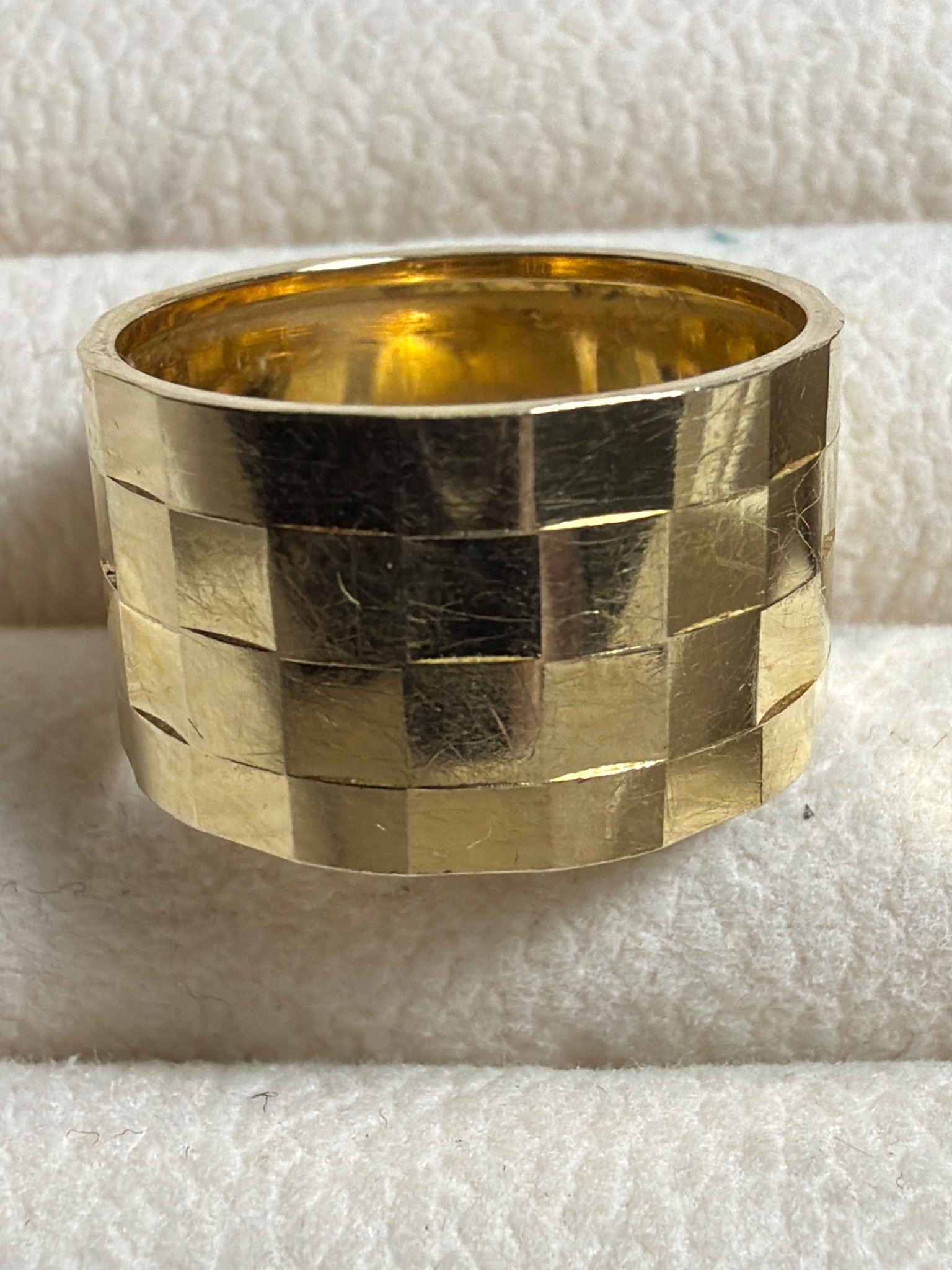 This item is a wide, substantial yellow gold wedding or fashion band, often referred to as a 'cigar band' due to its significant width. The exterior features a distinct geometric design consisting of three horizontal rows of square facets, creating a checkerboard or quilted texture that catches the light from various angles. The ring appears to be crafted from high-karat yellow gold—possibly 18K or 22K—based on the rich, deep yellow saturation visible in the interior and the reflective facets. Physically, the band is thick and appears heavy, indicating solid metal construction rather than a hollow shell. The interior of the band is smooth and polished for comfort. Regarding condition, the piece shows evidence of significant wear, with numerous fine surface scratches, abrasions, and micro-pitting across the faceted surfaces, suggesting it was a daily-wear piece. The edges show slight softening from friction. No specific maker's marks or hallmarks are visible in the provided angle, though they are likely located on the inner shank. The style is mid-to-late 20th century, leaning towards a brutalist or modernist aesthetic that prioritizes metal texture and weight over gemstone embellishment. The craftsmanship is high, with precise alignment of the geometric facets despite the visible surface patina.