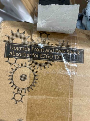This item is an aftermarket upgrade kit containing front and rear shock absorbers specifically designed for the EZGO TXT golf cart model. The product is contained within its original brown corrugated cardboard shipping or retail box. The packaging features black ink printing with a decorative gear graphic motif and a clear text label reading 'Upgrade Front and Rear Shock Absorber for EZGO TXT'. Physically, the box shows signs of handling, including clear adhesive packing tape applied over the top and a partially torn white paper label or sticker on the upper flap. The gears on the packaging are rendered in a halftone dot pattern, indicative of modern mass-production printing techniques. While the internal components are not visible, the packaging suggests a contemporary manufacturing date, likely within the last 5-10 years, intended for the automotive or golf cart maintenance and customization market. The condition of the box is fair to good, with some surface scuffing and tape residue, but the primary identification text remains legible for inventory and appraisal purposes. This type of high-utility item is valued for its functional compatibility with specific vehicle frames rather than aesthetic or antique value.