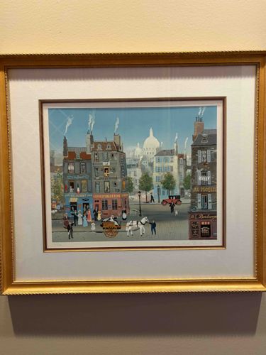 This is a fine art lithograph by renowned French 'naïve' artist Michel Delacroix, depicting a quintessential Parisian street scene in Montmartre with the Sacré-Cœur Basilica visible in the background. The artwork features Delacroix's signature nostalgic style, capturing a bustling Belle Époque atmosphere with horse-drawn carriages, vintage automobiles, and figures in period attire. The color palette is rich with muted greys and browns of the architecture contrasted against a bright blue sky and vibrant storefronts. The piece is hand-signed by the artist in the lower right margin and includes a limited edition numbering in the lower left (appearing to be '80/150' or similar, though partially obscured). The lithograph is professionally framed in an ornate, gold-toned wood frame with a rope-pattern border. It is double-matted with a textured white outer mat and a thin dark inner fillet. The construction utilizes high-quality printing techniques likely from the late 20th century. The condition appears excellent with no visible foxing, fading, or moisture damage to the paper. The frame shows minor surface dust but no significant chips or abrasions. The craftsmanship of the print showcases fine detail in the architectural smoke and intricate lettering on the 'Boulangerie' and 'Restaurant' storefronts.