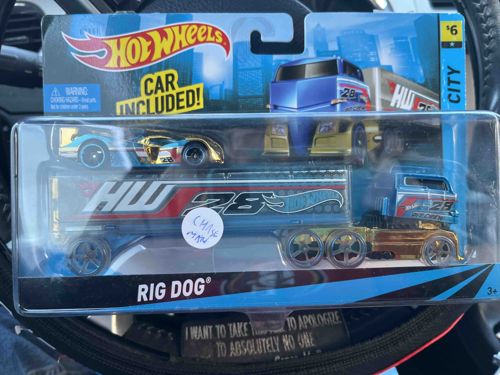 This item is a Hot Wheels City 'Rig Dog' hauler playset, presented in its original, unopened blister packaging. The package features a blue cityscape background and prominently displays the 'Hot Wheels' logo at the top left. A yellow banner declares 'CAR INCLUDED!', highlighting that the set contains both the truck and a companion vehicle. The price '6' is visible in the top right corner, likely indicating the retail price. The main components of the set include a large, blue and gold semi-truck cab, a matching trailer, and a smaller, gold and blue race car. The truck and trailer feature 'HW 28' branding and racing stripes in red and white accents, with the trailer having a large 'HW' logo. The race car has similar coloring and '28' numbering. A circular white sticker, possibly handwritten with 'CHASE MAN' (though heavily obscured), is adhered to the clear plastic packaging over the trailer, suggesting it might be a 'Chase' or special edition item. The overall condition appears to be mint, as it is sealed in its original packaging with no visible dents, creases, or damage to the card or plastic blister. The plastic offers a clear view of both vehicles inside. The color scheme of blue, gold, red, and white suggests a modern, dynamic aesthetic typical of Hot Wheels products. This particular set falls under the 'City' theme by Hot Wheels, catering to collectors and children alike aged 3 and up, as indicated by the '3+' age rating on the bottom right of the package. The craftsmanship is standard for Hot Wheels, focusing on vibrant colors, recognizable designs, and durable plastic and metal construction, indicative of mass-produced collectible toys.