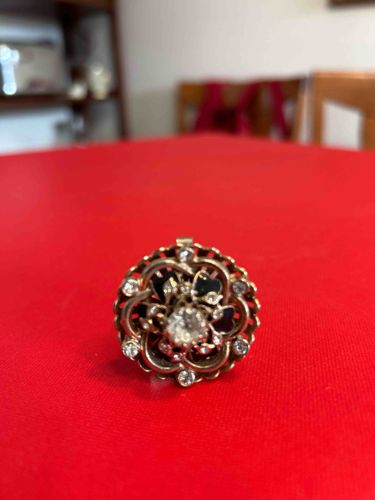 This is a vintage-style circular fashion ring featuring a layered floral or roselike motif. The ring is constructed from a gold-toned metal, likely brass or a gold-plated base metal, and has a diameter of approximately 20-25mm for the face. The design consists of an outer scalloped border set with several small clear rhinestones, surrounding an intricate middle section of interlocking metal loops. A large faceted centerpiece rhinestone serves as the focal point, accented by smaller pavé-set crystals and dark black enamel or lacquer detailing in the recessed areas to create depth. The construction suggests Mid-Century costume jewelry (circa 1950s-1970s). The condition shows visible signs of age, including some dulling of the stones, light oxidation on the metallic surfaces, and potential minor scratches to the enamel. No maker's marks are visible from this angle, but the craftsmanship displays a traditional prong-setting technique for the main stones. The overall style is ornate and characteristic of 'cocktail' jewelry intended for formal wear and high visibility.