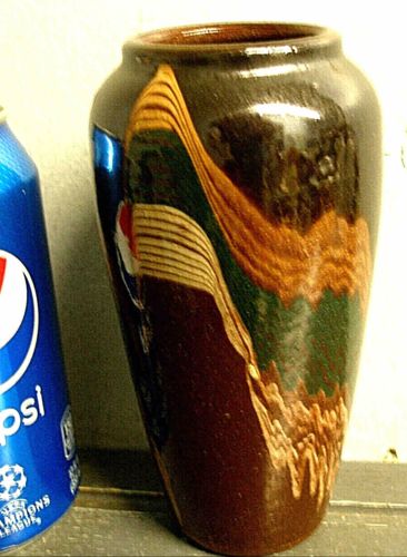 This item is an ovoid-shaped ceramic vase standing approximately 8 to 10 inches tall based on the scaling of the adjacent beverage can. The piece is constructed from high-fired stoneware or earthenware and features a multi-tonal drip-glaze aesthetic. The primary body color is a deep, chocolate brown with a semi-gloss finish. The decorative element consists of a broad, diagonal sweep of layered glazes in tones of ochre, moss green, and cream. These accent glazes exhibit a thick, textured application with linear 'combing' or sgraffito-style marks that provide a sense of movement. The top rim is slightly inverted with a smooth, glazed finish. The overall craftsmanship suggests a mid-20th-century studio pottery influence, likely from the 1960s or 1970s. The piece shows minor surface abrasions consistent with age and shelf wear, particularly near the base. There are no visible large-scale cracks or chips on the primary display surface. The glaze shows good vibrancy with a slight natural orange-peel texture characteristic of kiln-fired ceramics from this period. The absence of a visible maker's mark in the photo suggests it may be signed on the underside of the base.