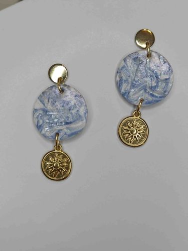 This pair of contemporary handmade earrings features a three-tier vertical drop design. Each earring is constructed with 18k gold-plated stainless steel hardware, beginning with a polished gold-tone circular stud post. Suspended from the post is a larger, custom-crafted disc made from polymer clay. This central component exhibits a marbled 'terazzo' effect, blending translucent whites with various shades of cornflower and cobalt blue. Embedded within the polymer clay are shards of natural kyanite, which provide a subtle crystalline shimmer and organic texture to the otherwise smooth surfaces of the discs. The kyanite shards create a distinctive multidirectional light play within the blue-and-white matrix. Hanging from the bottom of the polymer clay disc via a gold-plated jump ring is a final decorative element: a circular gold-tone coin charm featuring an embossed celestial sunburst or sun deity motif with radiating wavy rays. The earrings appear to be in excellent, new condition with no visible signs of metal oxidation, scratches, or wear to the clay surfaces. The craftsmanship indicates a 'boutique' or 'artisan' style common in late 21st-century modern jewelry making, characterized by the blending of synthetic materials like polymer clay with natural semi-precious gemstones and industrial metals like gold-plated stainless steel for durability.
