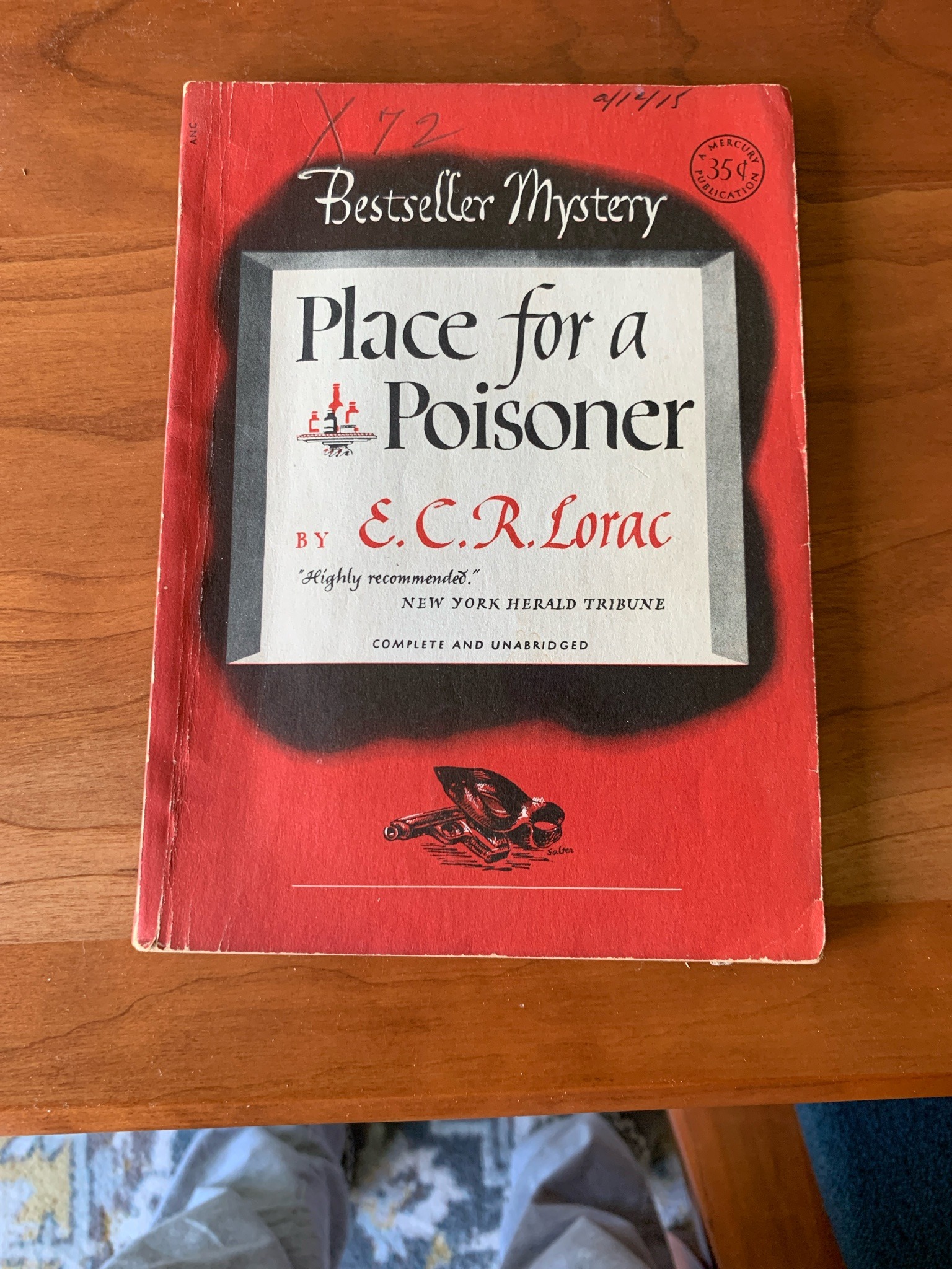 This is a vintage mass-market paperback edition of the mystery novel 'Place for a Poisoner' by E.C.R. Lorac (pseudonym for Edith Caroline Rivett), published as part of the 'Bestseller Mystery' series by Mercury Publications. The book features a softcard cover with a vibrant red background and a central black-and-white graphic frame. The cover includes a small illustrative vignette at the bottom showing a gun and a hat, signed by the artist 'Salter' (George Salter). A 'Mercury Publication 35¢' seal is visible in the top right corner. The volume is noted as being 'Complete and Unabridged'. Physically, the book exhibits significant signs of age and handling, including creasing along the spine, edge wear with minor chipping, and rounded corners. There are prominent handwritten notations in black ink on the top front cover, including 'X 72' and a date '9/12/15' (likely 1950s/60s era based on pricing and style). The binding shows stress at the joints, though it appears intact. This specific series was popular in the late 1940s and early 1950s, characterized by its digest-sized format and distinctive cover art. The presence of the Salter cover design is a hallmark of quality for this publishing house's aesthetic, adding collectible interest despite the visible wear and markings.