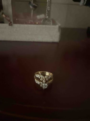 This is a yellow gold ring featuring a multi-stone cluster design. The central focus is a marquise-cut gemstone, likely a diamond, oriented vertically and flanked by smaller round brilliant-cut stones set in what appears to be a scalloped or 'V' shaped chevron arrangement. The metal work is finished in a high-polish yellow gold, likely 10k or 14k based on common jewelry standards for this style. The design suggests a vintage or estate aesthetic, consistent with late 20th-century jewelry (circa 1980s-1990s). The stones are held in individual prong settings which create a tiered, crown-like appearance. While the image is slightly out of focus, the craftsmanship appears to involve a split-shank or wide-band base that tapers toward the back. There are no clearly visible maker's marks or hallmarks in this view, though they would typically be found on the interior of the shank. The condition appears fair with visible light reflecting off the stones, suggesting they are clean, though the metal may have minor surface scratches consistent with use.
