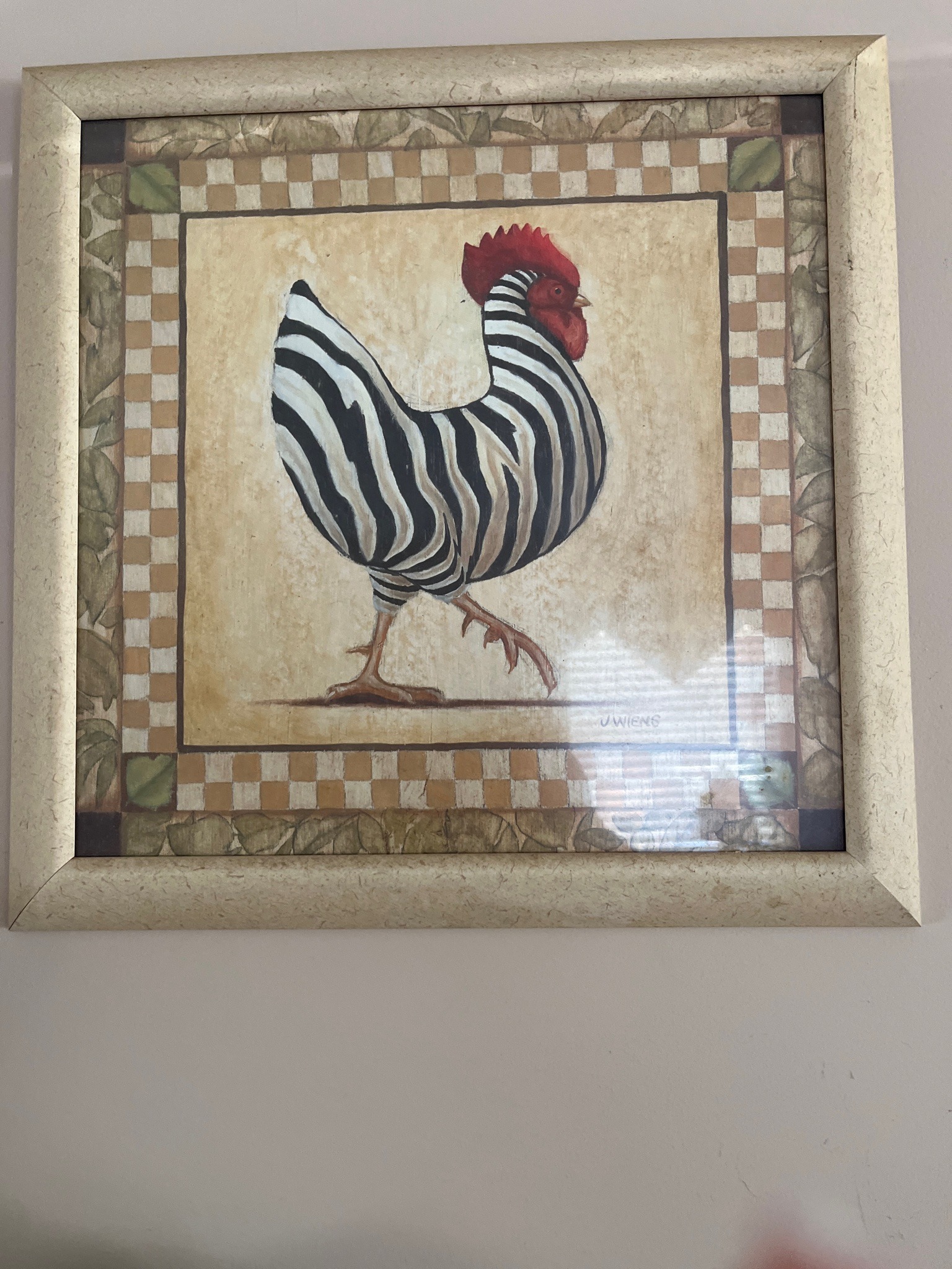 This is a square, decorative art print housed in a cream-colored, textured frame with a beveled profile. The central subject is a stylized rooster, characterized by a striking black and white striped body reminiscent of a zebra pattern, topped with a vibrant red comb and wattle. The artwork is executed in a folk-art or 'country chic' style common in the late 1990s and early 2000s. The rooster is set against a textured, parchment-colored background. Surrounding the central image is a multi-layered border consisting of a thin black inner line, a tan and white checkered pattern, and an outer faux-finish border featuring muted green leaves. The artist's signature, 'J. WIENS' (belonging to artist June Wiens), is clearly visible in the lower right quadrant of the image. The print appears to be protected by glass or acrylic, which reflects some ambient light. The frame shows mild wear consistent with age, but no significant chipping or structural damage is evident. The overall composition suggests a mass-produced decorative piece designed for kitchen or dining room interiors, prioritizing a rustic Americana aesthetic with modern graphic elements.