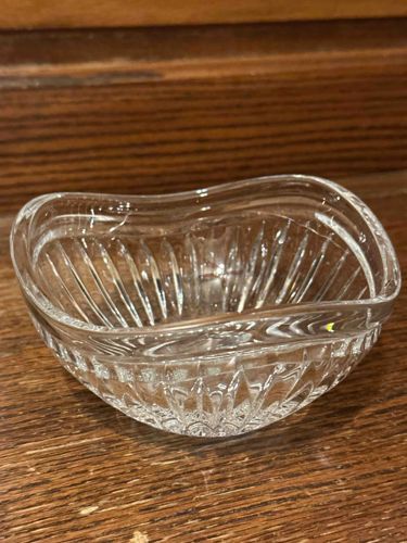 This is a heavy, clear pressed-glass small bowl or nut dish, often referred to as a nappy. The piece features a distinctive kidney or oval-shaped profile with a gracefully undulating or scalloped rim. The design consists of vertical fluting or ribbing on the interior walls that transitions into a cross-hatched or 'diamond' pattern near the base, creating a brilliant light refraction typical of mid-century glass. The exterior appears smooth toward the top with the decorative cutting providing a tactile grip near the bottom. Based on its clarity and substantial weight, it is likely lead crystal or high-quality soda-lime glass, possibly manufactured between the 1940s and 1960s by a company such as Imperial, Fostoria, or Heisey. The bowl shows no visible chips, cracks, or significant surface clouding, suggesting it has been well-maintained. The rim is fire-polished to a smooth finish, indicative of quality machine-pressed craftsmanship. There are no immediate visible maker's marks, though such pieces often carried paper labels originally. Its compact size and stylized wavy edge make it a classic example of American brilliant-style influenced table service and a functional piece of vintage glassware.