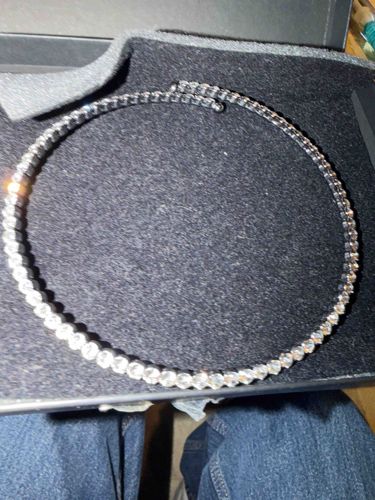 This item is a contemporary tennis-style choker necklace featuring a continuous row of round-cut clear faceted stones, likely cubic zirconia or high-quality crystals. The stones are set in a bright, silver-toned metal, possibly rhodium-plated brass or sterling silver, utilizing a classic four-prong or bezel-like setting for each individual link. The necklace is designed in a rigid, circular bypass or 'open' choker style, which suggests it has some inherent flexibility for ease of wear without a traditional clasp. The craftsmanship appears uniform, with each stone exhibiting consistent color and clarity. The metal shows a reflective, polished finish with no immediate signs of significant tarnishing or metal fatigue. The stones reflect light with high brilliance, indicative of machine-cut facets. No visible maker's marks or hallmarks are identifiable in the current view, but the overall aesthetic aligns with modern costume or fine fashion jewelry from the late 20th to early 21st century. The condition appears to be excellent with all stones present and secure, showing no obvious scratches or clouding to the refractive surfaces.
