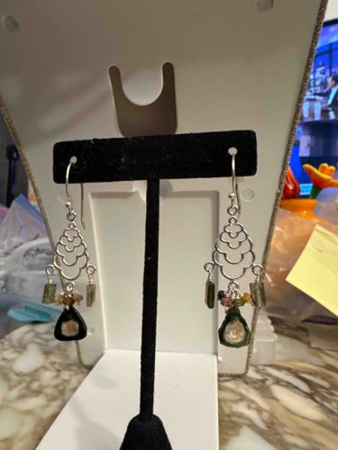 A pair of handcrafted chandelier-style earrings featuring semi-precious watermelon tourmaline gemstones and sterling silver components. Each earring is suspended from a polished silver French wire hook. The central decorative element is a tiered, openwork filigree metal frame with a scalloped, scale-like pattern reminiscent of Art Deco or Moroccan aesthetic influences. Hanging from the base of this frame are multiple gemstone dangles. The primary focal point of each earring is a triangular-cut watermelon tourmaline slice, showcasing a natural pink or light centers surrounded by a dark green perimeter, mimicking the rind of a watermelon. These slices are likely natural beryl or tourmaline with visible internal inclusions and natural crystalline structures. Flanking the central slices are vertical tourmaline baguettes or bars and smaller round faceted beads in autumn tones of gold, olive green, and burnt orange. The metal appears to be sterling silver with a bright finish. The overall condition is excellent with no missing stones; however, the gemstones show natural 'garden' inclusions which are standard for these materials. These earrings likely date from the late 20th century to the modern day, exhibiting a bohemian or artisan-crafted style. The construction utilizes fine wire-wrapping techniques to secure the accent beads to the larger frame, demonstrating precise hand-assembly and attention to detail.