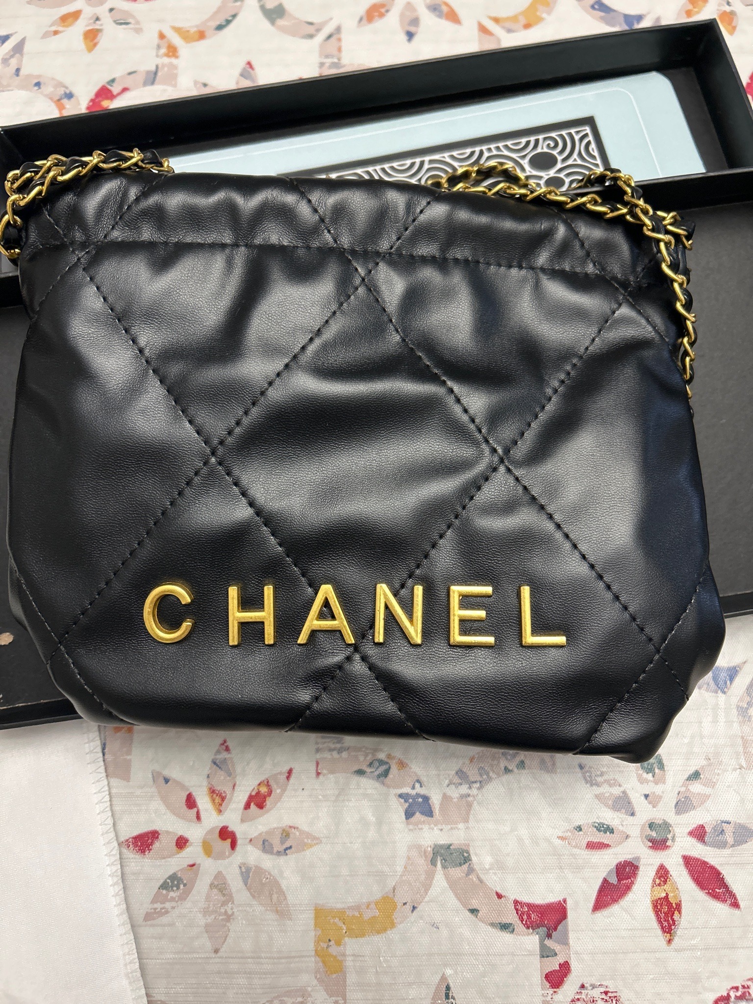 This is a Chanel 22 bag, an iconic accessory launched in the Spring-Summer 2022 collection. The item is crafted from supple, high-quality black quilted calfskin leather, characterized by its soft, shiny finish and large diamond quilting pattern. A distinctive feature is the 'CHANEL' logo rendered in bold, gold-tone metal block letters across the lower front facade. The bag features a slouchy, bucket-like silhouette with a drawstring closure mechanism that integrates into the strap system. The shoulder strap is a classic Chanel design: a leather-interlaced gold-tone metal chain that provides both durability and a luxurious aesthetic. Regarding condition, the leather displays a characteristic 'lived-in' look with some visible creasing and undulation consistent with the soft nature of calfskin, though it maintains a rich luster. The gold hardware appears bright with minimal scratching. The craftsmanship is evident in the precise, high-density stitching of the large-scale quilting. This modern style represents a shift toward more casual, functional luxury, making it a highly desirable piece in the contemporary secondary market.
