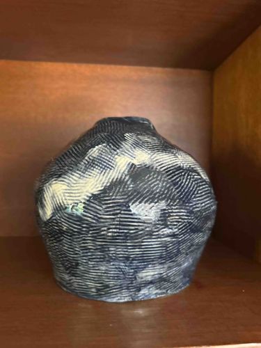 This is a contemporary hand-built ceramic vessel, likely crafted from stoneware or a similar high-fire clay, featuring a globular, organic form with a tapered neck and base. The piece is distinguished by its intricate sgraffito decoration, a technique where a dark slip or underglaze (appearing here in charcoal or deep navy) is applied over a lighter clay body and then scratched away to reveal the contrasting color beneath. The geometric pattern consists of fine, rhythmic horizontal and cross-hatched lines that create a vibrating, textured visual effect across the surface. While no maker's marks are visible in the current orientation, the irregular, asymmetrical silhouette suggests a manual, non-wheel-thrown construction, possibly pinch or coil method, which aligns with modern studio pottery styles. The color palette is monochromatic, emphasizing form and surface texture. The condition appears stable with no major cracks or chips visible; however, the matte finish and dark tones may show minor surface scuffs over time. Based on the provided context of 'ten years,' the piece likely dates to the early 2010s, representing a work of contemporary ceramic art that focuses on mark-making and tactile surface treatment.
