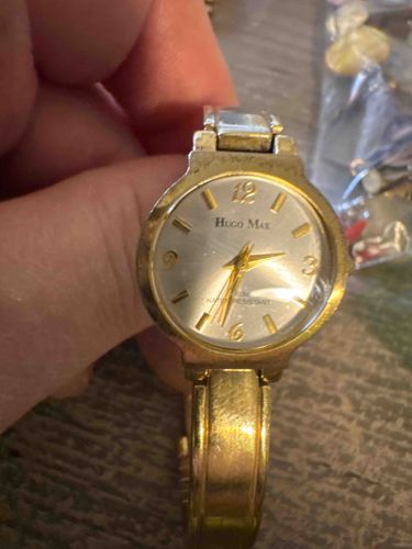 This is a contemporary women's analog wristwatch featuring the brand name 'Hugo Max' on the dial. The watch is constructed with a circular brass-colored or gold-tone metal case and an integrated bangle-style expansion bracelet. The dial is finished in a sunburst silver-tone metallic sheen with gold-tone applied hour markers, featuring Arabic numerals at the 12, 3, 6, and 9 positions, and simple batons for the remaining hours. The three-hand movement includes a gold-toned hour, minute, and second hand. Text on the bottom of the dial indicates it is '100FT Water Resistant.' Regarding physical condition, the item shows significant signs of wear typically found in base-metal costume jewelry. There is noticeable plating loss and pitting on the bezel and the lugs, revealing a darker base metal underneath. The crystal appears relatively clear but may have light surface scratches. The integrated metal band shows scuffing and dulling of the finish from frequent use. Based on the branding and materials, this is likely a mass-market quartz fashion watch from the late 20th or early 21st century designed for budget-conscious consumers. The overall craftsmanship is consistent with lower-tier retail accessories, using plated alloy rather than precious metals.