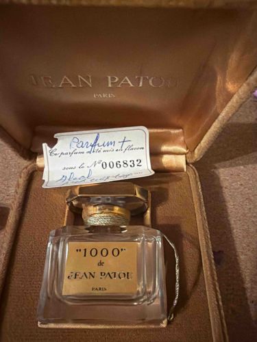 This set features a vintage bottle of '1000' de Jean Patou, presented in its original gold-toned, satin-lined presentation case. The bottle is a heavy, clear crystal flacon of rectangular form with beveled corners, typical of French haute parfumerie. It features a gold-tone label with the fragrance name '1000' and 'JEAN PATOU PARIS' in black serif font. The stopper is an octagonal, multifaceted glass cap with a gold-tone bezel, secured with the traditional 'baudruchage' technique—a gold thread seal around the neck—indicating it is the pure parfum concentration. Accompanying the bottle is an original paper certificate or batch label, hand-annotated in blue ink with 'Parfum+' and the unique bottle number No. 006832. This fragrance was first launched in 1972, and based on the packaging and numbering system, this exemplifies a late 20th-century production. The interior of the box lid is embossed with 'JEAN PATOU PARIS' in gold lettering. The overall condition appears excellent with some oxidation to the gold label and minor fraying of the silk-covered presentation insert, though the paper tag shows some age-related toning and small tears at the edges.