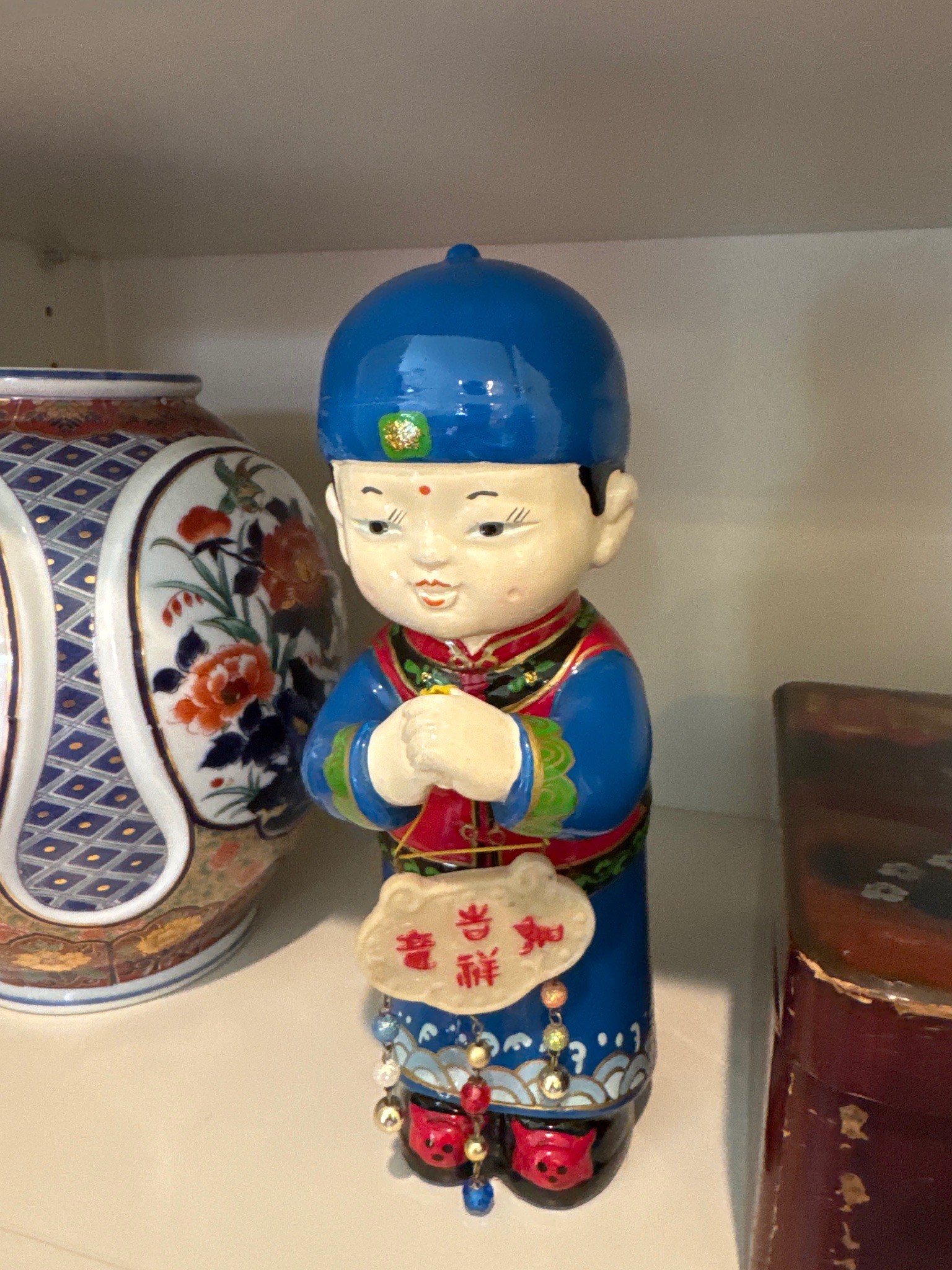 This is a mid-to-late 20th-century Chinese ceramic figurine of a 'Fortune Boy,' typically utilized during Lunar New Year celebrations to symbolize prosperity and good luck. The figurine is constructed from slip-cast ceramic with a glossy overglaze finish. He is depicted in a traditional 'Gong Shou' greeting pose with hands clasped together. He wears a vibrant cobalt blue cap and matching robe, accented with intricate red, green, and gold polychrome enameling along the collar and sleeves. The lower hem features a stylized wave pattern. Hanging from his clasped hands is a ruyi-shaped plaque with auspicious red Chinese characters (likely referencing 'Ruyi' or good fortune) and dangling decorative bead tassels in various colors. The facial features are delicately hand-painted with fine eyelashes and a soft 'Urna' or forehead dot. Regarding condition, the piece shows some minor surface wear and small paint losses typical of age, particularly around the edges of the base and the hanging plaque. The craftsmanship is indicative of high-volume decorative production from the 1970s-1990s, though it remains a charming example of folk-style auspicious art. There are no visible maker's marks on the exterior, though the base (not seen) may contain a stamped 'Made in China' mark.