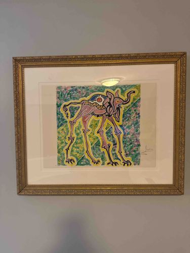 This item is a framed, multi-color lithograph depicting a 'Space Elephant,' a recurring motif in the surrealist works of Salvador Dalí. The central figure is a stylized, skeletal elephant with exaggeratedly long, spindly multi-jointed legs, rendered in shades of pink, purple, and gold with heavy black outlines. The elephant is set against a vibrant, impressionistic background of stippled greens, yellows, and pinks. A yellow aura outlines the figure, adding to the dreamlike quality. The piece features a facsimile or hand-pencil signature in the lower right corner, consistent with Dalí's artistic branding. It is housed in an ornate, gilded wood frame with a classic gadroon or beaded pattern along the inner and outer edges. The artwork is professionally matted with a cream-colored acid-free mat, protected under glass. The overall construction suggests a late 20th-century production, likely part of an authorized posthumous or late-lifetime series. Condition appears excellent with no visible foxing, fading, or paper waviness, though slight glare from the glass is present in the photography. The frame shows minor shelf wear but remains structurally sound. The craftsmanship reflects high-quality printmaking techniques characteristic of mid-to-high-end surrealist art reproductions.