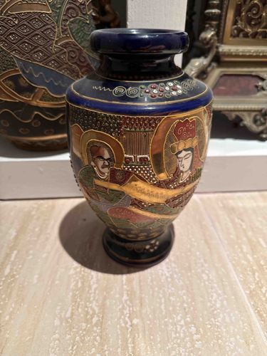 This is a vintage Japanese Satsuma-style porcelain vase, characterized by an ovoid body, a tapered neck with a rolled rim, and a matching pedestal base. The primary glaze is a deep, rich cobalt blue that appears on the neck, shoulder, and foot. The central frieze features a traditional hand-painted scene depicting multiple figures, likely immortals or Arhats, characterized by halo-like auras and ornate robes. The decoration utilizes the moriage technique, which involves raised, slip-trailed enamels that provide a Three-dimensional tactile quality to the jewelry, garment patterns, and facial features. Heavy gold gilt highlights are used throughout the central band to create a sense of opulence typical of later Meiji or early Showa period exports. The color palette includes earthy reds, forest greens, and creamy whites set against the golden background. Regarding condition, the vase shows some light surface wear and potential fading of the gold gilt on the raised edges. There are no visible cracks or large chips in the main body, though the base shows minor scuffing consistent with age. The craftsmanship displays the dense, busy aesthetic referred to as 'thousand faces' style, common in decorative items produced for the Western market in the early 20th century.