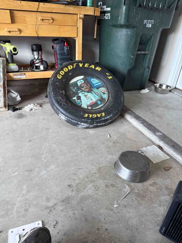 This is a decorative wall clock designed to resemble a Goodyear Eagle racing tire, a prominent brand in NASCAR. The clock features a black rubberized outer 'tire' frame with 'GOODYEAR' and '#1' printed in bold yellow lettering on the top, and 'EAGLE' on the bottom. The center face of the clock displays a circular portrait of legendary NASCAR driver Dale Earnhardt Sr. Earnhardt is wearing his iconic 'GM Goodwrench' racing suit and sunglasses. The item appears to be made of molded plastic and rubber materials to simulate a real racing tire on a slightly reduced scale. Notable features include the detailed graphics on the interior face and the recognizable yellow tire lettering. Regarding condition, the item shows significant signs of wear and environmental exposure. There is visible white scuffing and residue along the bottom edge of the tire frame, and the surface appears dusty and uncared for, likely stored in a garage or workshop setting. The clarity of the watch face seems intact, though there is general grime buildup across the unit. This piece likely dates from the late 1990s to the early 2000s, coinciding with the peak of Earnhardt's career and the subsequent memorial memorabilia period following 2001. It represents a mass-produced piece of sports fan memorabilia intended for display in 'man caves' or themed automotive spaces.