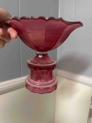 This item is a decorative pedestal bowl, often referred to as a comport or tazza, crafted in the Victorian style. The piece is made of cranberry glass, a type of gold ruby glass known for its deep pinkish-red hue achieved through the addition of gold salts. The bowl features a flared, wide rim with a delicate scalloped edge and vertical fluting that extends toward the base of the vessel. It is supported by a thick, multifaceted pedestal base with architectural, tiered molding and a hexagonal bottom. The glass displays varying levels of opacity, with the thicker base sections showing a denser, slightly more violet-pink tone compared to the translucency of the bowl. The construction suggests a combination of mold-pressing and finishing, characteristic of mid-to-late 19th-century or early 20th-century glassware production. In terms of condition, the piece shows no visible cracks or deep chips in this view, though minimal shelf wear is expected on the underside of the faceted base. The glass possesses a clear, vibrant brilliance, indicating high-quality lead content or expert craftsmanship. This style of glass was popularized by companies like Fenton or various Bohemian glassmakers, serving as both utilitarian serving pieces and highly collectable art glass.
