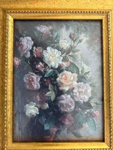 This item is a rectangle-formatted still life floral composition, appearing to be a high-quality lithograph or print housed within an ornate frame. The artwork features a dense, diagonal arrangement of blossoming roses and peonies in varying shades of cream, pastel pink, and deep mauve, accented by dark green foliage and unopened buds. The background is rendered in a soft, atmospheric painterly style with muted earth tones and glimpses of light filtering through trees. The piece is set in a traditional gold-finished (gilt) wood or composition frame that includes a decorative beaded inner border (beaded fillet) and a textured, matted gold surface. While no clear signature is visible in the provided image, the style heavily references the Romanticism or Victorian era, likely produced in the late 20th century as a decorative reproduction. The frame shows some minor surface wear and a light patina appropriate for age, while the print appears well-preserved under glass with consistent color saturation throughout the floral elements. The overall craftsmanship of the framing reflects a mid-to-high-end decorative accessory intended for traditional interior design aesthetics.