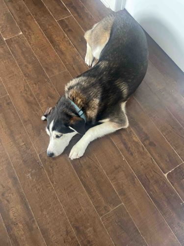 This living biological specimen is a medium-to-large sized domestic dog, appearing to be a mixed breed with likely Siberian Husky or Alaskan Malamute heritage based on the coat pattern and facial structure. The coat is a classic 'agouti' or sable pattern, characterized by a dark black and charcoal dorsal saddle that transitions into tan and cream tones along the flanks and legs. The underbelly and paws are predominantly white. Physically, the dog displays a thick, double-layered coat indicative of cold-weather breeds. The facial markings feature a distinct white blaze and 'mask' common in northern breeds, with dark ears. Notably, the animal is wearing a plain light-blue or teal woven nylon collar, which serves as a contemporary accessory. The specimen is shown in a resting 'loaf' position on a medium-toned wood laminate flooring. Its condition appears healthy, with a clean, well-groomed coat and no visible signs of injury or distress. The age is difficult to pinpoint exactly, but the clarity of the white fur and lack of significant muzzle greying suggests a young adult to middle-aged animal. The overall proportion and muscular build indicate a high-energy working breed lineage.