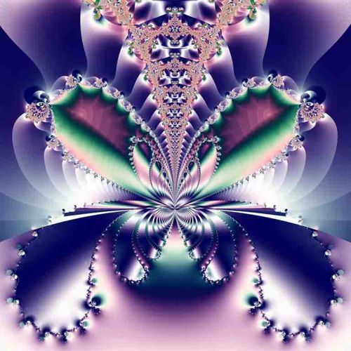This is a complex, symmetrical digital fractal artwork titled 'Butterfly Blues.' The piece is a high-resolution digital image capable of printing as a TIFF file up to 33x33 inches without distortion, suggesting a high-quality master file format. The composition features a central vertical axis with mirrored biological and geometric patterns that resemble a butterfly or a blooming orchid. The color palette is dominated by deep indigos, lavenders, and soft purples, contrasted with vibrant teal-greens and shimmering pearlescent whites. Mathematically generated Mandelbrot or Julia set-inspired textures create intricate, lace-like edges and beaded borders that give the image a three-dimensional, almost sculptural feel. The lighting is ethereal, appearing to emanate from the core of the structure, highlighting the 'ribbed' and 'veined' textures of the digital forms. The construction relies on recursive algorithms to achieve infinite detail, a hallmark of fractal art from the late 20th to early 21st century. The condition is pristine as a digital asset, showing no signs of pixelation or compression artifacts in the source format. The style is contemporary abstract, blending elements of psychedelic art with mathematical precision.