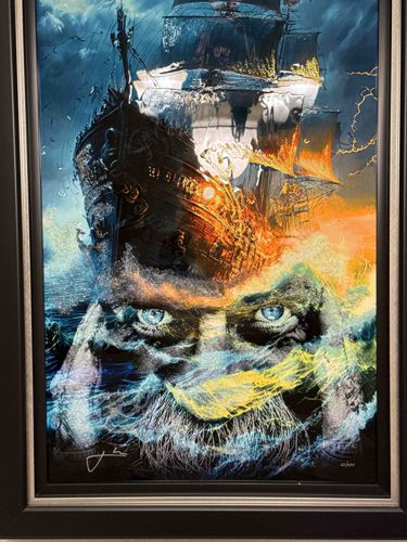 This is a vibrant and complex mixed media artwork on paper or canvas, attributed to contemporary artist Michael Kors. The piece features a striking double-exposure composition: the upper portion depicts a large, detailed sailing vessel caught in a tempest with golden highlights suggesting fire or bioluminescence on its sails, while the lower portion reveals a weathered face of an older man with piercing blue eyes, integrated into the cresting ocean waves. The color palette is dominated by deep blues, teals, and blacks, contrasted sharply with warm oranges, yellows, and white highlights. Notably, the artwork includes a distinct silver-white signature in the lower left corner and a numbering or edition mark (likely 'XX/YYY') in the lower right, indicating it is from a limited edition series. The work is professionally framed in a tiered dark wood or composite frame with a delicate silver inner fillet. The condition appears excellent with no visible fading, moisture damage, or abrasions to the print surface. The craftsmanship shows high-quality digital or screen-printing techniques layered with possible hand-embellishments to create texture and depth. This contemporary piece reflects a modern narrative style, likely produced within the last 10 years.