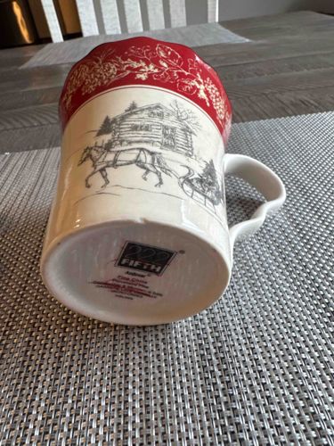 This is a festive, tall beverage mug manufactured by 222 Fifth for their 'Adelaide' collection. The piece is constructed from fine china with a glossy glazed finish. It features a distinctive scalloped or wavy rim and a unique ergonomic handle with finger indentations for comfortable gripping. The exterior design focuses on a nostalgic winter landscape, depicting a horse-drawn sleigh passing a rustic log cabin, rendered in detailed black line-art transfer print against an off-white or cream background. The top of the mug is crowned with a broad crimson red band decorated with intricate white floral and vine motifs, reminiscent of traditional toile or transferware patterns. On the bottom, a clear manufacturer's backstamp identifies the brand as '222 FIFTH' and the pattern as 'Adelaide'. The mark also specifies 'Fine China' and indicates that the item is microwave and dishwasher safe. The craftsmanship shows high-quality transfer application with consistent coloring. Regarding condition, the mug appears largely intact with vibrant colors; however, there is a visible small chip or nick located on the bottom footed rim (the base), which is a common area for wear. No visible crazing or staining is observed in the provided view, suggesting it has been well-maintained overall. This pattern typically dates to the early 21st century and remains a popular choice for seasonal holiday tableware.