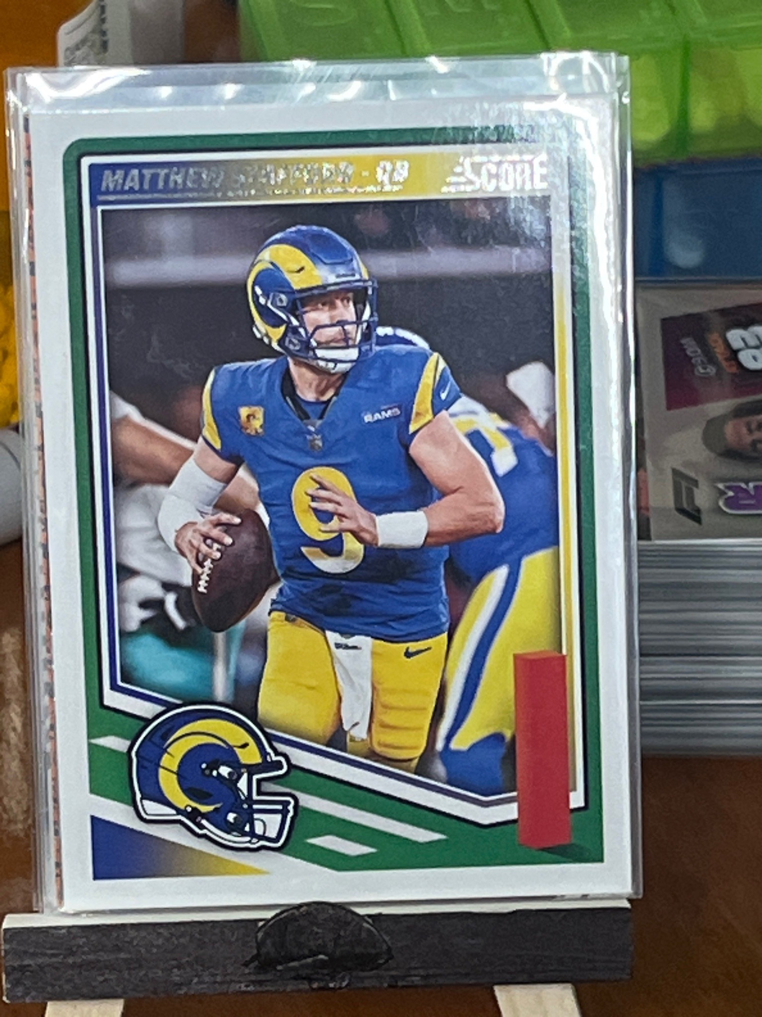 This is a standard-sized modern football trading card from the 2022 Score set, featuring Los Angeles Rams quarterback Matthew Stafford. The card design utilizes a multi-colored border scheme with a prominent green outer edge and a white interior border. The central photography captures Stafford in his home blue and yellow Rams uniform, mid-action with a football. The upper banner displays 'MATTHEW STAFFORD - QB' in a stylized font next to the 'SCORE' brand logo. A graphic representation of a Rams helmet is positioned at the bottom left, while a red vertical design element sits at the bottom right. The card is composed of heavy cardstock with a glossy finish. It is currently housed in a protective soft plastic sleeve (penny sleeve) and displayed on a small wooden stand. Based on the visual inspection, the card appears to be in Excellent to Near-Mint condition; the corners appear sharp through the sleeve, with no obvious surface abrasions or creases. The centering looks slightly offset towards the right border. This 2021 release celebrates Stafford following the Rams' Super Bowl LVI victory, a key period in his career.