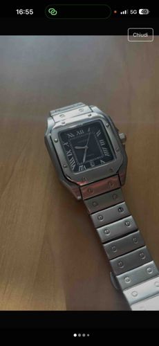 This is a luxury stainless steel wristwatch featuring the iconic square case design of the Cartier Santos. Although the user prompt mentions 'Tag Heuer,' the visual evidence clearly identifies this as a Cartier Santos. The timepiece features a brushed stainless steel case and a matching integrated bracelet, both characterized by the signature exposed functional screws. The dial is a deep ADLC (Amorphous Diamond-Like Carbon) black with contrasting white Roman numeral hour markers and a rail-track minute circle. It includes a date window at the 6 o'clock position and sword-shaped steel hands. The bezel is fixed by eight screws, maintaining the industrial yet refined aesthetic of the 1904 original. Based on the proportions relative to the bracelet width, this appears to be the 'Large Model' variant. The condition appears to be pre-owned with light surface scratches (swirlies) on the bezel and bracelet links, consistent with regular wear. No major gouges or diamond-set modifications are visible. The craftsmanship is high-end, featuring the 'SmartLink' adjustment system and 'QuickSwitch' interchangeability typical of modern Santos models produced in the late 2010s to present.