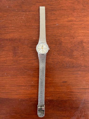 This is a vintage ladies Rolex cocktail watch, likely from the Orchid collection, dating approximately to the 1960s or 1970s. The timepiece features a petite round case crafted from what appears to be 18k white gold or platinum, accented by a bezel meticulously set with brilliant-cut diamonds. The dial is a champagne or light silver tone with gold-tone stick hour markers and the iconic Rolex coronet at the 12 o'clock position. It is paired with an integrated Milanese mesh bracelet, showcasing high-quality craftsmanship with a seamless taper from the lugs to the clasp. The bracelet is finished with a folding jewelry clasp. Regarding condition, the watch shows signs of light wear consistent with age, including microscopic scratches on the case and bracelet. The mesh remains tight without visible kinks or significant fraying. The crystal appears clear with no major chips. While the movement is not visible, these models typically house a manual-wind mechanical caliber. The overall aesthetic represents the mid-century luxury jewelry-watch style, emphasizes elegance over utility, and reflects the premium manufacturing standards of Rolex's dress watch history.