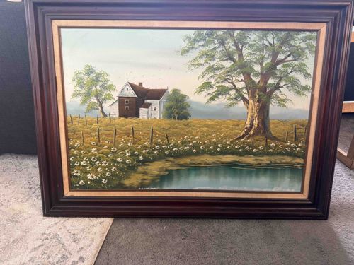This and landscape oil painting on canvas depicts a serene rural scene, likely originating from the mid-to-late 20th century. The composition features a white farmhouse with a barn-style roof under a soft, overcast sky. In the foreground, a field of white wildflowers and a weathered wooden fence lead the viewer's eye to a small, reflective pond. A large, prominent deciduous tree anchors the right side of the canvas, showing detailed bark texture and lush green foliage. The color palette is dominated by earthy ochres, greens, and muted blues. The piece is housed in a substantial dark wood frame with a molded profile and an inner gold-toned liner slip that provides a classical border. The painting style is representative of 1970s commercial or decorative landscape art, characterized by soft blending in the sky and impasto highlights on the flowers. Condition-wise, the frame shows light surface wear consistent with age, while the canvas appears taut with no visible punctures or significant craquelure. No artist signature is clearly visible in the provided view, suggesting it may be a student or decor-market work typical of the era.