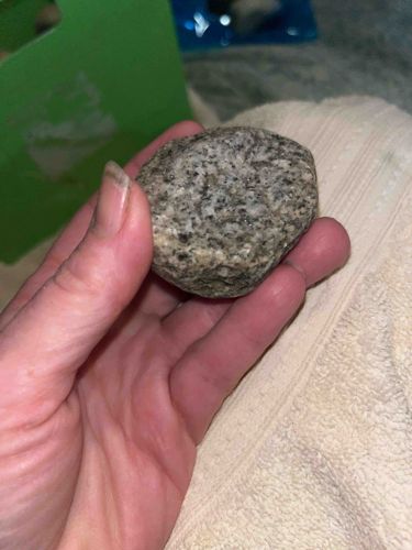 This item is a natural geological specimen, specifically a coarse-grained phaneritic igneous rock, likely granite or diorite. Physically, the specimen is approximately 2 to 2.5 inches in diameter, fitting comfortably within a human palm. It exhibits a salt-and-pepper coloration consisting of interlocking crystals in shades of light gray, white, and translucent beige (likely quartz and feldspar), interspersed with dark black or deep green flecks (likely hornblende or biotite mica). The texture is rough and crystalline, indicating slow cooling deep beneath the Earth's surface. The shape is sub-rounded to sub-angular, suggesting it may have been subjected to some degree of fluvial or glacial transport, which has softened its sharpest edges while maintaining an overall irregular geometry. There are no visible maker's marks, as it is a naturally occurring mineral formation rather than a manufactured object. The condition appears stable, with no obvious fractures or cleaving, though the surface shows typical natural weathering with a matte patina. Such specimens are ubiquitous in geological formations and are common examples of intrusive igneous rocks, often used in building materials or as educational teaching aids for mineralogy and geology students.