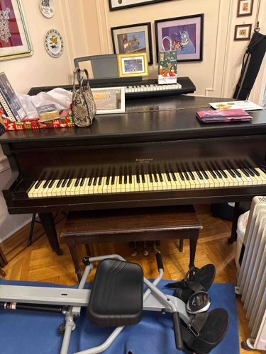 This is a vintage baby grand piano manufactured by the Stuyvesant Piano Co. of New York. The instrument features a classic dark mahogany or ebony wood finish with a satin sheen. Its physical construction includes a standard 88-key keyboard, though the keys exhibit significant yellowing, suggesting they are likely original ivory or an older celluloid composite. Centered above the keys is the maker's mark 'Stuyvesant, NEW YORK' in gold metallic lettering. The piano is supported by tapered spade legs, typical of the early 20th-century style (circa 1910-1930). Visible condition issues include minor surface scratches and scuffing on the wood case, particularly along the edges and near the legs. The fallboard and lid show some dust accumulation and surface wear consistent with age and domestic use. The piano is accompanied by a matching rectangular wooden bench with similar finish wear. The presence of a radiator nearby and its placement on a wooden parquet floor suggests potential exposure to humidity fluctuations, which may affect the internal soundboard and tuning stability. The craftsmanship appears robust, reflecting the solid manufacturing standards of the Aeolian Company era, under which the Stuyvesant brand operated.