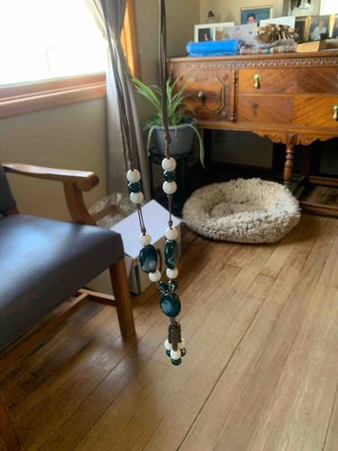 This is a long, handcrafted bohemian-style necklace featuring a combination of earthy materials. The piece is constructed on what appears to be a brown leather or waxed cord, suggesting a rustic or handmade aesthetic. The design incorporates a variety of beads: large, polished teal-green agate or glass discs with internal swirling patterns, paired with round white pearlized beads and smaller dark green spacers. The necklace features a Y-shaped drop design that culminates in a multi-strand tassel detail at the bottom. The construction uses knotting techniques between bead clusters to provide structural security and a relaxed drape. The color palette is composed of natural forest greens, cream whites, and deep brown tones. This item likely dates from the late 20th to early 21st century, falling under the category of contemporary artisanal jewelry. The condition appears fair to good with no immediate visible chips to the beads, though the cord shows some signs of use and flexibility. The craftsmanship is informal, focusing on organic textures rather than high-jewelry precision.