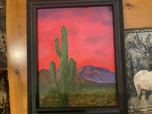 This is an original oil painting on board or canvas by a local Houston artist, measuring approximately 9” by 11” within its frame. The composition features a prominent Saguaro cactus in the foreground, rendered with vertical brushstrokes that emphasize its texture and form. Behind the central cactus sits a desert floor with smaller vegetation, leading to a range of rugged mountains in shades of purple and tan. The sky is the most striking feature, finished in vibrant hues of magenta, coral, and red, suggesting a deep sunset. The artist's signature is visible in the lower right corner, though the name is stylized. The work is housed in a contemporary black wooden frame with a slight beveled profile. The condition appears to be excellent with no visible signs of surface cracking (craquelure), fading, or punctures. The application of paint is thick in areas, indicating a confident impasto technique particularly in the saguaro's ribs. The style is representational with a focus on dramatic color, typical of late 20th or early 21st-century regional American landscape art. The contrast between the cool mountain tones and the warm sky provides a balanced visual harmony, reflecting high-quality craftsmanship from a local artisan perspective.