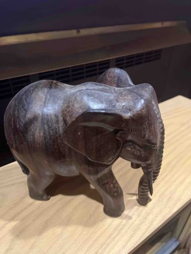 This item is a hand-carved decorative figurine of an African elephant, likely crafted from a dense, dark-grained tropical hardwood such as ebony, rosewood, or ironwood. The sculpture features a medium-brown to dark chocolate patina with visible natural grain patterns throughout the body. The elephant is depicted in a walking stance with its trunk lowered and curled inward. Notable anatomical details include incised lines on the ears and trunk to represent skin texture and folds. The tusks appear to be carved from the same solid block of wood rather than being inset materials. In terms of condition, there is a prominent surface crack or 'check' visible running vertically down the rear haunch, which is common in older wooden sculptures due to humidity changes. The surface shows a light accumulation of dust in the recessed carvings and some mild scuffing on the top of the head and shoulders, suggesting an age likely from the mid-to-late 20th century. This style of folk art is traditionally associated with East African carving traditions (such as the Makonde) or Southeast Asian export markets. No visible maker's marks or signatures are present in the provided view, indicating a workshop or artisanal origin rather than a specific artist-signed piece. The craftsmanship is solid, with a heavy, substantial appearance and stylized anatomical proportions.