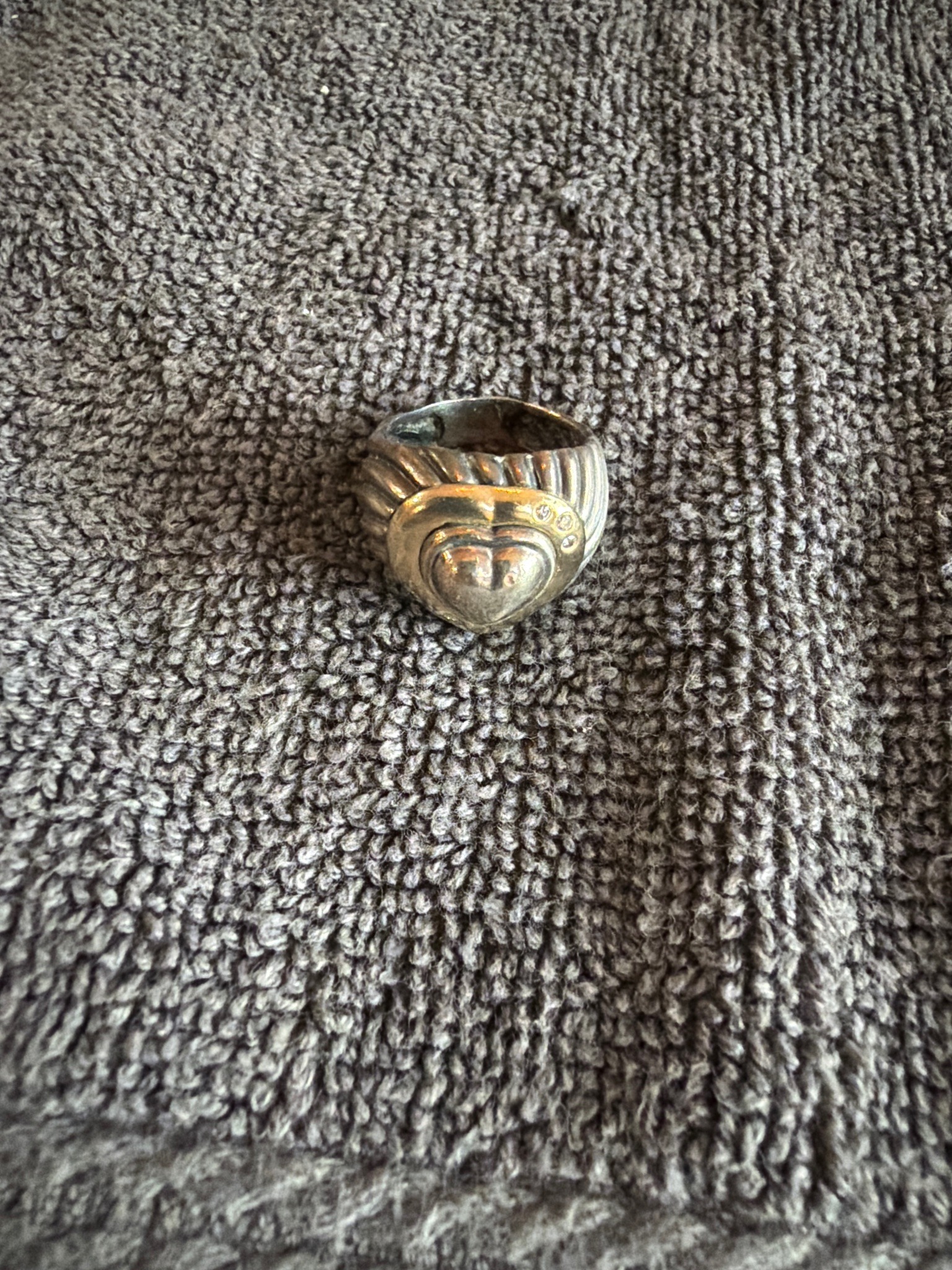 This is a luxury designer ring from the David Yurman 'Cable' collection. The piece features a central multi-layered puff heart motif. The innermost heart is polished sterling silver, partially framed by a 14k yellow gold border that is accented with three small, round-cut diamonds on the upper right edge. Behind this heart focal point, the band transitions into Yurman's signature cable twist aesthetic, consisting of thick, sculpted ridges. The ring appears to be constructed from high-quality sterling silver and yellow gold accents. Regarding condition, the piece shows significant signs of age and wear. There is noticeable tarnish and oxidation (patina) nestled within the cable grooves and surrounding the heart, which is common for sterling silver items that have not been recently polished. Surface scratches and minor indentations are visible on the polished silver surfaces of the heart. The craftsmanship is consistent with high-end designer jewelry, showing solid construction and integrated mixed metal elements typical of the late 20th to early 21st century. While maker's marks are not clearly visible in the top-down photo, the interior of the shank would typically be stamped with 'D.Y.' and metal purity marks like '925' and '585'.