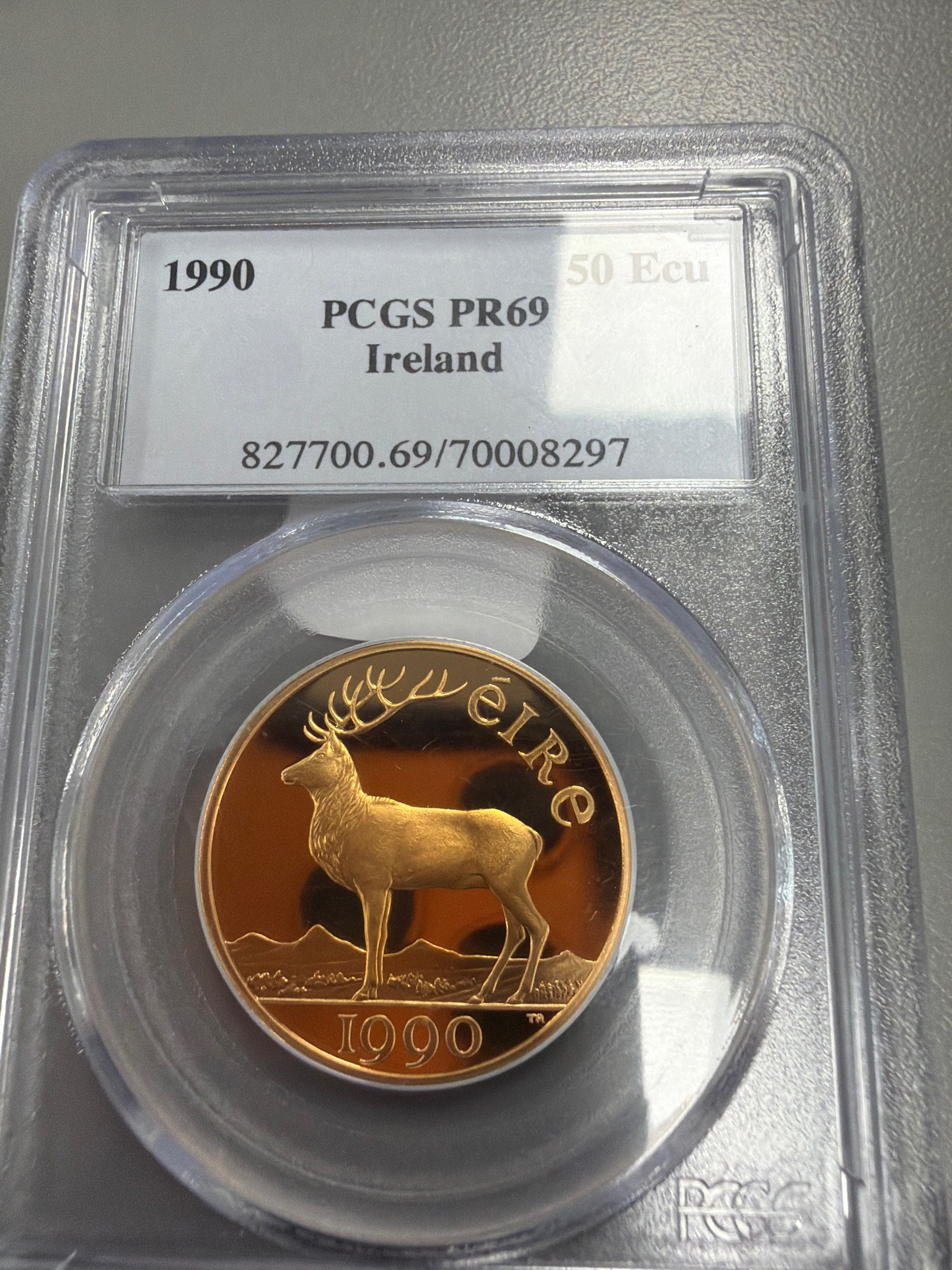 This is a premium numismatic item consisting of a 1990 gold 50 ECU (European Currency Unit) coin from Ireland, professionally graded and encapsulated by PCGS (Professional Coin Grading Service). The coin is struck in .900 fine gold, weighing approximately 15 grams with a diameter of roughly 28mm. The obverse design featured in the image displays a majestic Irish Red Deer (fallow deer) standing before a mountainous landscape, with the Irish word for Ireland, 'ÉIRE', inscribed above and the date '1990' below. The reverse, though not visible, traditionally features a Celtic harp and the denomination. This specific specimen is graded PR69 (Proof 69), indicating a nearly perfect proof strike with deep mirror-like fields and frosted relief (Cameo effect). The gold exhibits a vibrant orange-gold tone with no visible marks, hairlines, or carbon spots, indicating exceptional preservation. It is presented in a modern tamper-evident PCGS plastic slab with the certification number 827700.69/70008297. The ECU coins were precursors to the Euro and are highly collected for their historical significance in European monetary union history, as well as their high-quality craftsmanship and gold content. This particular mintage is limited, making it a desirable piece for both gold investors and collectors of Irish coinage.