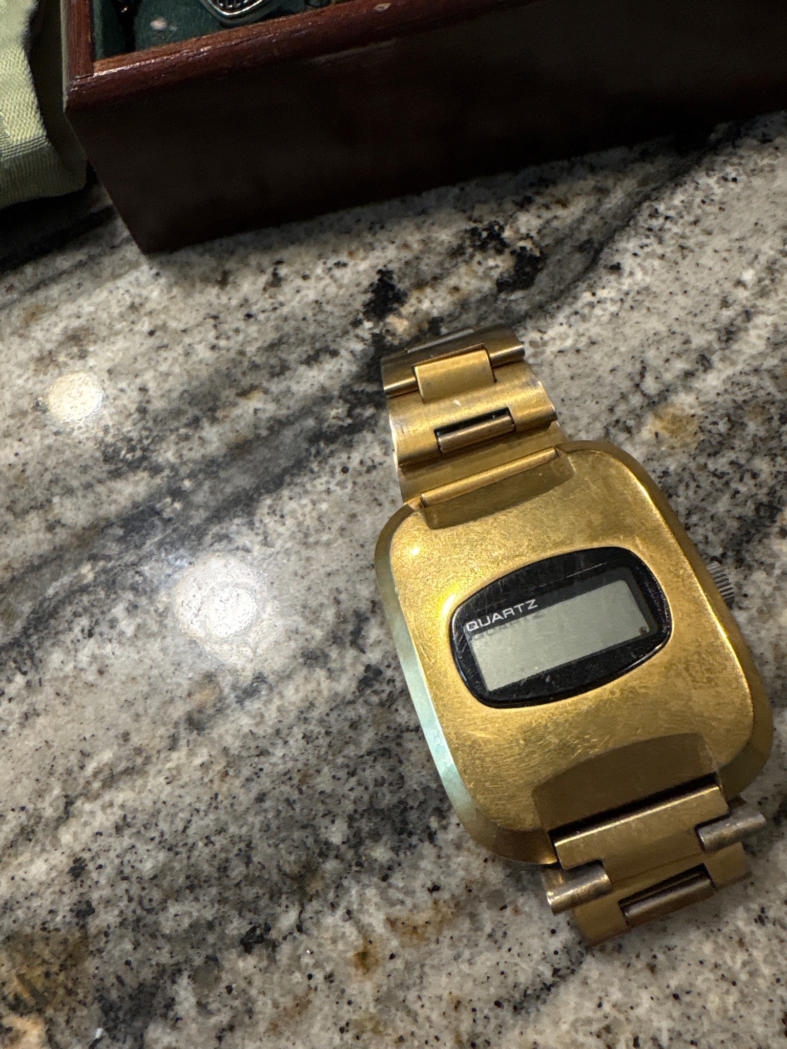This is a vintage digital wristwatch, likely dating from the mid-to-late 1970s or early 1980s, an era defined by the 'Quartz Revolution.' The timepiece features a distinctive oversized, retro-futuristic cushion-shaped case with a gold-tone finish. The case is integrated with a matching three-link oyster-style bracelet, also in a gold-tone metal. The face of the watch consists of a small, horizontal Liquid Crystal Display (LCD) screen recessed within a black oval border. The word 'QUARTZ' is printed in white sans-serif lettering at the top left of the display window. Physically, the watch exhibits significant signs of age and wear. The gold plating shows extensive surface scratching, micro-abrasions, and a noticeable dulling of the original luster, particularly on the leading edges of the case and the flat surfaces of the bracelet links. There is evidence of 'brassing' or plating loss on some of the higher-friction areas, revealing a base metal underneath. The crystal/LCD cover appears to have minor scuffing around the edges. A single metal button or crown is visible on the right side of the case, typical for setting the time on early digital modules. The LCD screen currently appears blank, which could indicate a dead battery, a failed circuit, or bleeding of the liquid crystal, common in vintage modules. The chunky, utilitarian construction is characteristic of budget-friendly mass-market brands of the period, such as Texas Instruments, Timex, or generic department store labels.