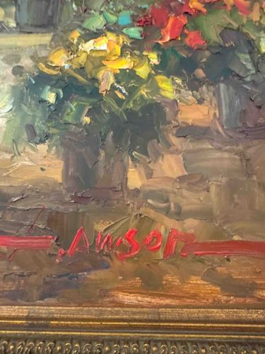 This item is an original oil painting on canvas or board, executed in a bold, impressionist style characterized by heavy impasto. The composition features a vibrant floral arrangement or garden scene with a palette dominated by warm yellows, reds, and deep greens, balanced by earthy brown and ochre tones in the foreground. The brushwork is expressive and architectural, with thick applications of paint creating a tactile, three-dimensional surface that catches the light. A prominent signature, 'Anson,' is rendered in bright red pigment in the lower-right quadrant, integrated into a decorative horizontal red stroke. The work is housed in a carved, gilt-finished wooden frame with beaded detailing along the inner lip. While the age is difficult to pinpoint from a detail shot, the style and framing suggest a late 20th-century contemporary work. The condition appears sound, though the thick oil layers require careful inspection for any potential drying cracks or 'craquelure' common in impasto techniques. The craftsmanship demonstrates a confident hand with a focus on color theory and movement rather than precise realism.