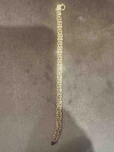 This is a fine jewelry bracelet meticulously crafted in 14kt yellow gold, featuring a sophisticated Byzantine (or King's) link pattern. The bracelet is composed of intricate, interwoven circular and oval links that create a substantial, fluid rope-like appearance. It consists of multiple repetitive segments separated by decorative wire-wrapped gold bars, which add structural integrity and a refined aesthetic texture. The yellow gold exhibits a high-polish finish with a warm, lustrous tone characteristic of 14-karat purity. The piece is approximately 7 to 8 inches in length and is secured with a heavy-duty, oversized lobster claw clasp for durability. While specific maker's marks are not fully visible in the image, the finish suggests a high level of craftsmanship with no visible kinking or broken links. The overall condition appears to be excellent, showing only minor superficial surface wear consistent with light use. The classic Byzantine style suggests a contemporary production, likely from the late 20th to early 21st century. The density of the metalwork indicates a significant gold weight, contributing to its value as both a decorative accessory and a precious metal investment.