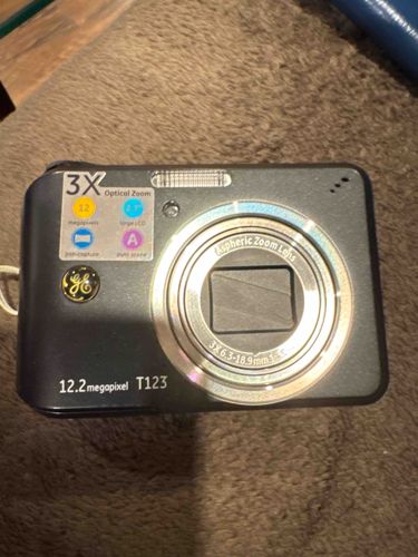 This is a GE T123 point-and-shoot digital camera featuring a 12.2-megapixel sensor and an Aspheric 3X optical zoom lens (6.3-18.9mm f/3.0-5.9). The camera is finished in a matte charcoal or black plastic housing with a metallic silver-tone ring around the lens assembly. The front face of the camera displays several original marketing stickers highlighting key features: a 3X optical zoom, 12 megapixel resolution, a 2.7-inch LCD screen, pan-capture capability, and auto scene selection. The iconic 'GE' roundel logo is prominently displayed in gold on the lower left. The build is compact and Rectangular with rounded edges, typical of mid-2000s consumer electronics design. Condition-wise, the unit appears to be in well-maintained cosmetic state with minor surface dust and no immediately visible deep scratches or impact damage to the chassis. The lens curtain is currently closed, protecting the internal glass elements. It includes a built-in horizontal flash bar and a three-hole microphone/speaker array in the upper right corner. This model belongs to the late 2000s era of digital photography when high megapixel counts in compact forms were the primary market driver. The overall craftsmanship is representative of mass-market consumer grade electronics from General Electric's licensing partners during that period.