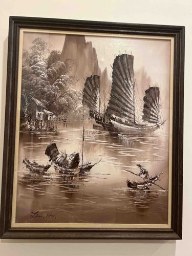 Framed Mid-Century Sepia Tone Oil Painting of Junk Boats
