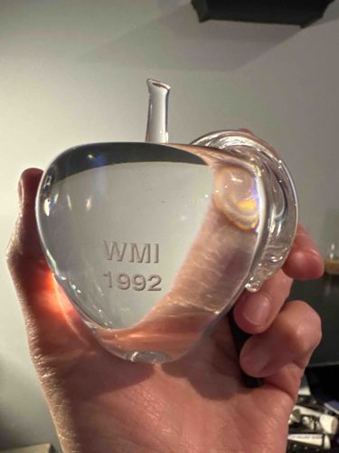 This is a fine crystal paperweight in the form of an apple, a signature design of Steuben Glass Works. The piece is crafted from high-quality, brilliant leaded glass, demonstrating the exceptional clarity and refractive index characteristic of the maker. It features a solid, smooth spherical body with a slight indentation at the top where a delicate glass stem and a broad, textured leaf are attached through glass-blowing techniques. The front of the apple is custom-engraved with the initials 'WMI' above the year '1992' in a clean, sans-serif block font. The piece reflects light beautifully, indicating it was well-annealed. Measuring approximately 3 to 4 inches in height, this item exemplifies American luxury glass craftsmanship from the late 20th century. The condition appears excellent with no visible chips, cracks, or internal fractures. The glass remains clear without 'sickness' or clouding. The base likely has a subtle flat-ground surface for stability, which is often where the 'Steuben' signature is etched in a cursive script, though it is not visible in this specific view. This piece likely served as a corporate gift or commemorative award given in 1992.